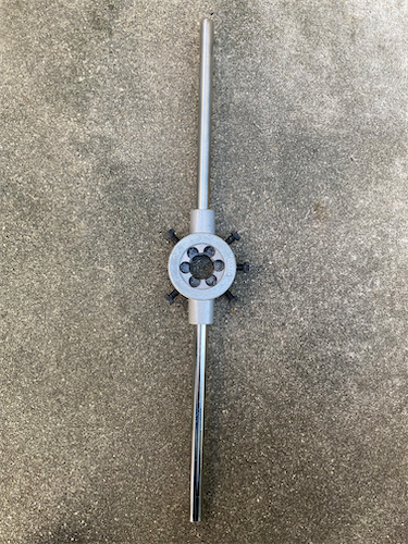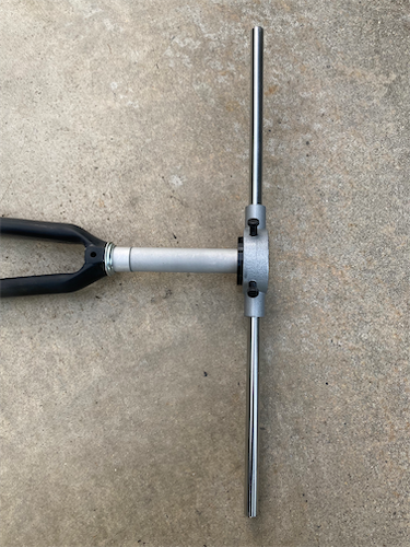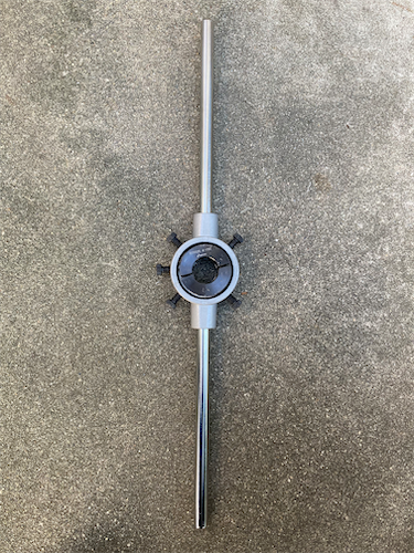 ・コラムカットのあと、1インチダイス(ダイス 2,525円、ダイス ハンドル 3,675円)+1インチカラー(右写真中央部の黒い部分。799円。カラーを接着剤でダイス下面に固定しガイドとすることでコラムに対して垂直にダイスを当てることができる。古いスレッドフォークを治具として使ってカラーの位置決め・固定・接着剤の乾燥を行った。)でねじ切り。最初の食いつきのところでダイスが垂直に入いれば良いので、接着剤固定で強度は十分だ。後で外せるしね。当面外さないけど。