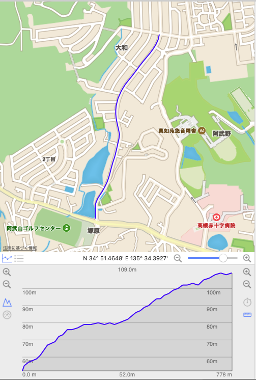 距離 0.78km、平均斜度6.1%、高度差 48m(最大斜度は10〜11%くらい?)