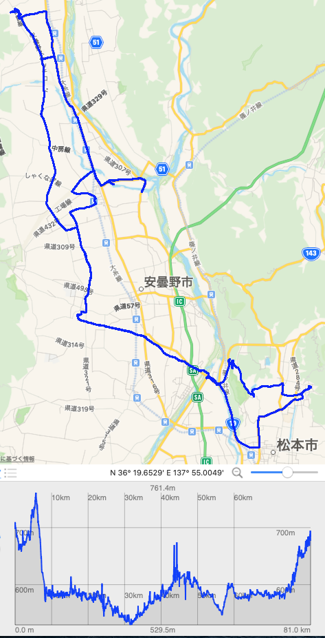 浅間温泉→女鳥羽川越えて松本松岡簡易郵便局→143号線→岡田東区→塩倉池→