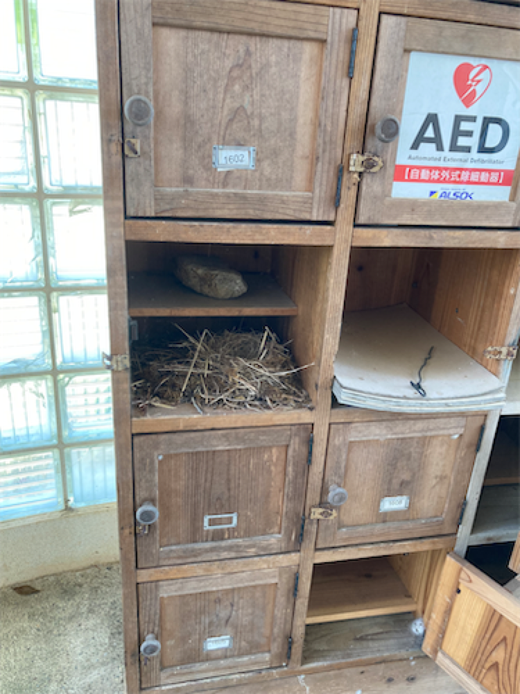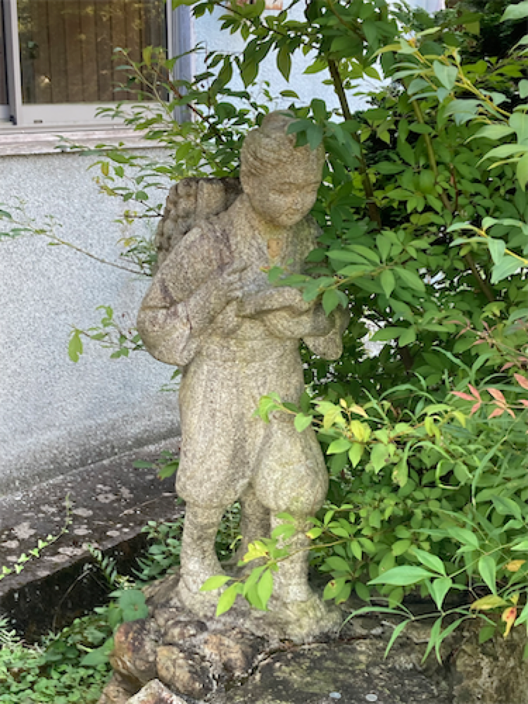 靴箱の中に鳥が巣を作っていた?! 花崗岩を刻んで作られた二宮金次郎さんの像。