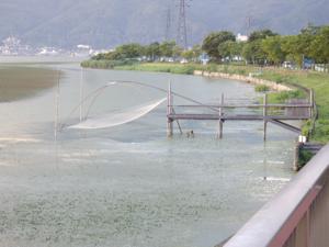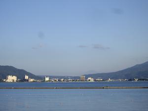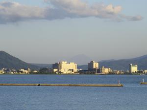 中山道で下諏訪へ下り、諏訪大社下社春宮参拝後、まっすぐ下りて湖岸に出ると富士山が。